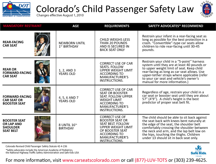 . Car seat laws in Colorado are in place for children between the ages of 1 to 15 where young infants need to be in a car seat which should be rear-facing until they cross 20 pounds in. According to Colorado law Section 42-4-236. In Colorado law a child under the age of eight must be properly.